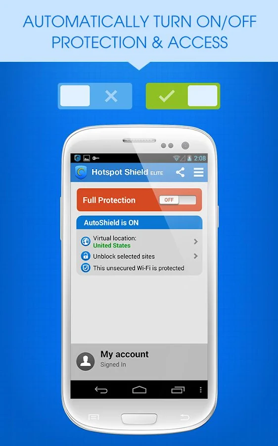 Hotspot Shield VPN for Android offers Wi-Fi security, Internet & online privacy, as well as access to blocked content & apps such as Facebook, Netflix, BBC, Skype and YouTube. Activate with 1 simple click, then you’re safe.